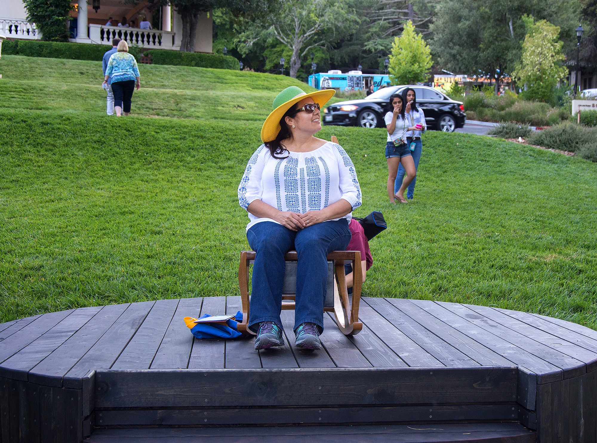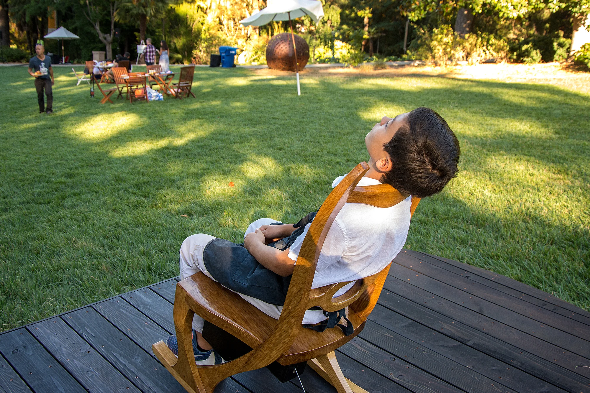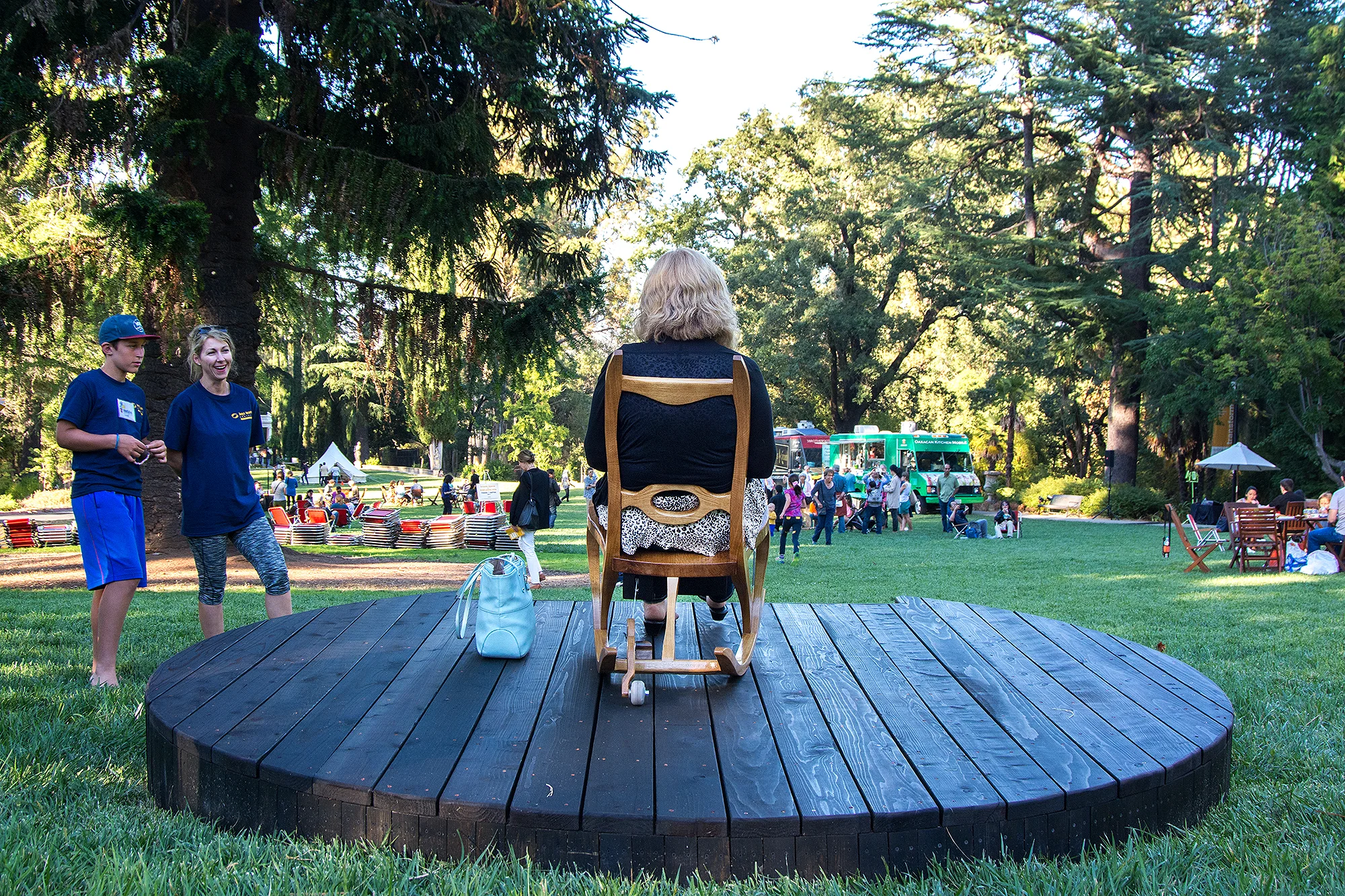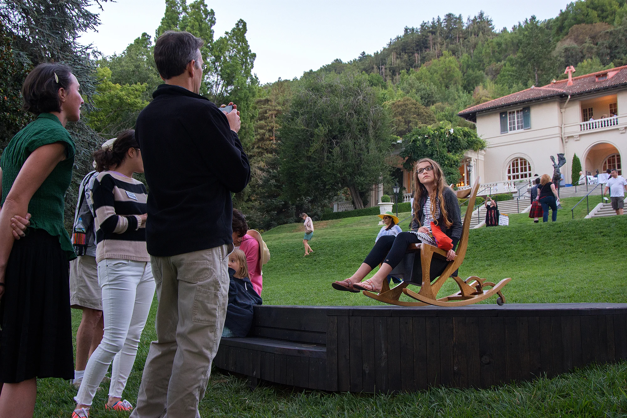 Nafasi... consists of a handmade white oak rocking chair on a low circular deck on the great lawn at Villa Montalvo in Saratoga, California. The empty chair is a symbol of absence when the work is unoccupied. One reason for choosing a rocking chair is that it can’t be rushed. It has a particular cadence and rhythm.